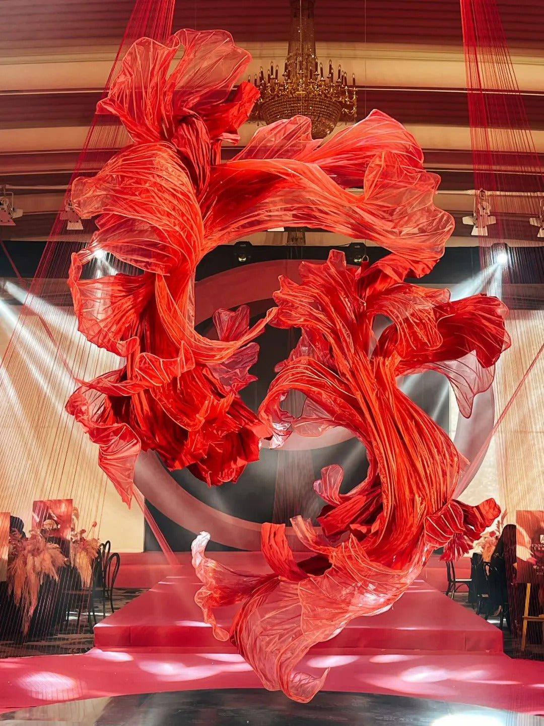 A stunning cascade of vibrant red decorations drapes down from the ceiling, enveloping the space in a warm embrace. The vibrant hues inspire passion and celebration, creating an enchanting atmosphere of joy and togetherness.”