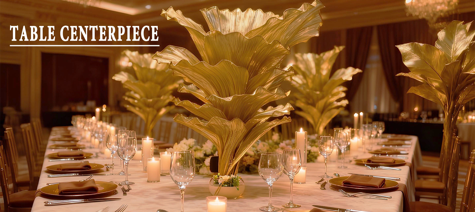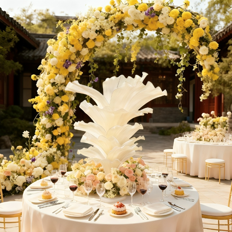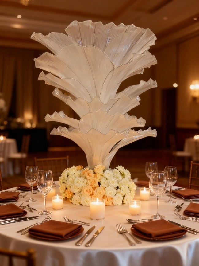 This "layered feather fan" floral centerpiece blends soft cream textures with warm champagne roses, paired with gilded tableware and candlelight to infuse luxury into every banquet detail.