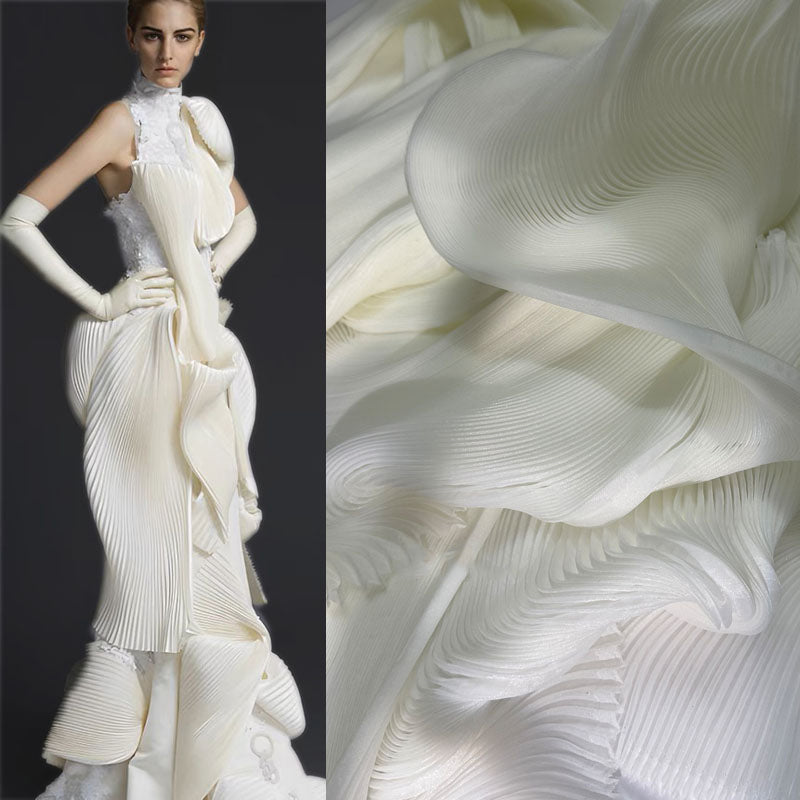 Flowerva Milk White Pleated Organza Pleated Fabric With Firm And Concave Design For Stage Handmade Dress Unique Fabric Design