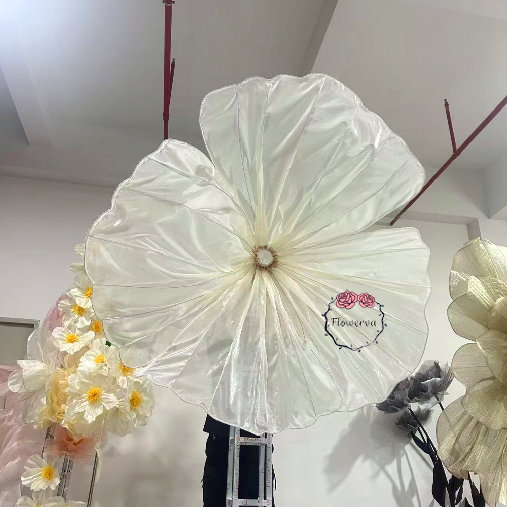 Our giant ivory floral piece draws inspiration from the quiet lushness of ivory blooms unfurling in morning mist—each petal is hand-shaped, cut from rich, velvety non-translucent fabric that holds a soft, substantial fullness. The gentle, organic folds mimic a flower’s natural unfurling, free of harsh lines: just a rounded, luminous silhouette that captures a moment of romantic stillness in fabric.