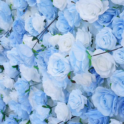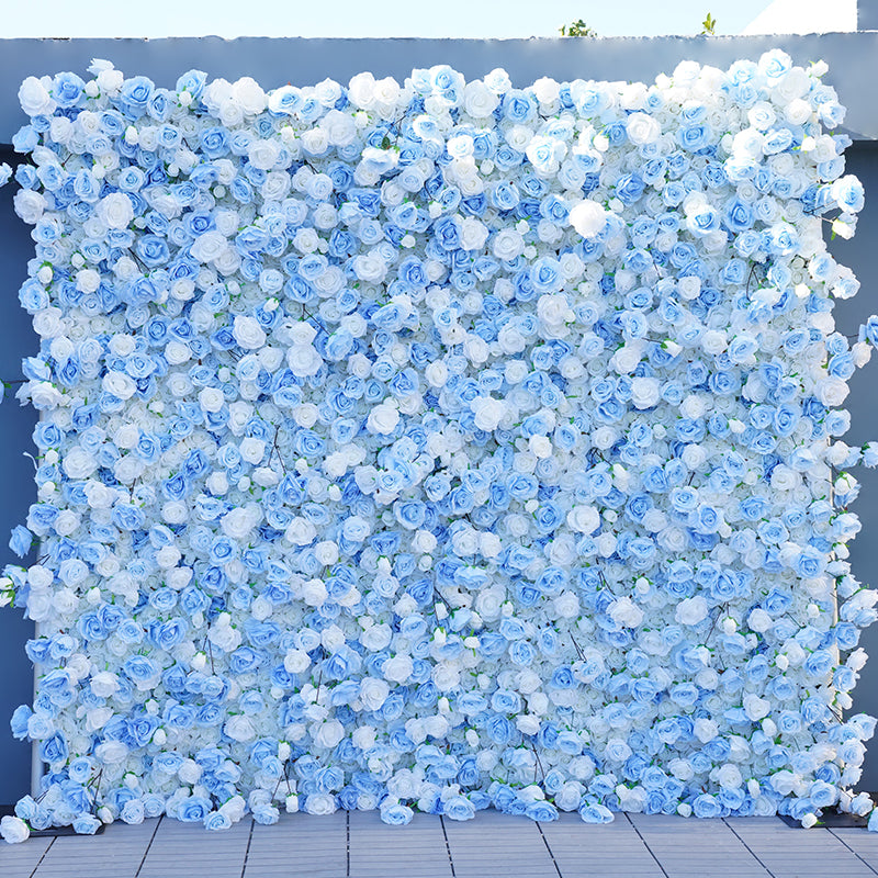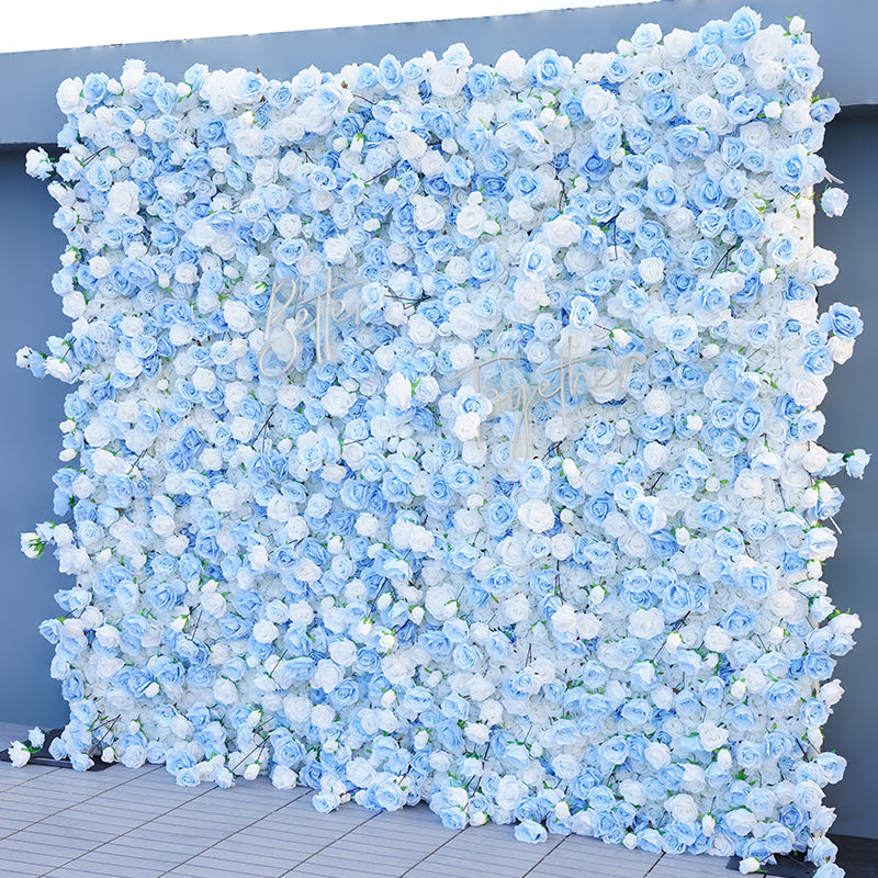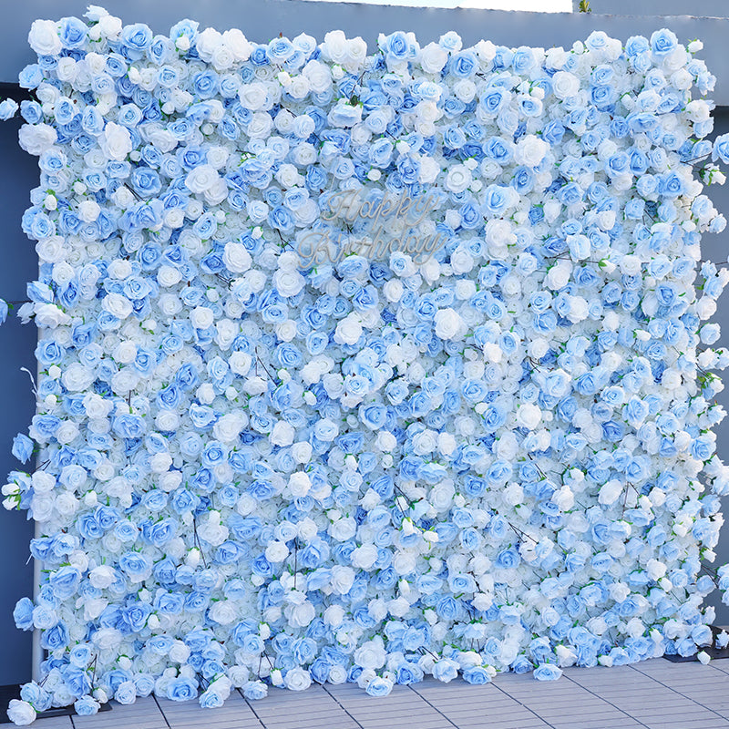 Flowerva – rideau en tissu Rose bleu blanc, enroulable 5D, mur de fleurs, Arrangement de décoration d'arrière-plan extérieur pour fête de mariage