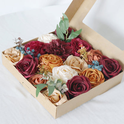 Fleurs en soie simulées : rose rouge foncé x6, rose orange x2, fleur blanche x2, rose rose clair x3, autres fleurs x, 2