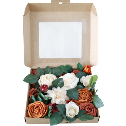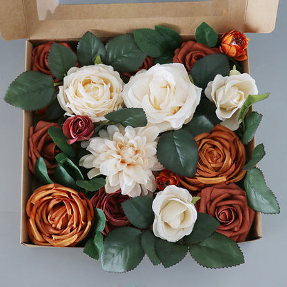 Fleurs en soie simulées : pivoine blanche x5, rose orange x6, rose rouge x2, autres fleurs x2