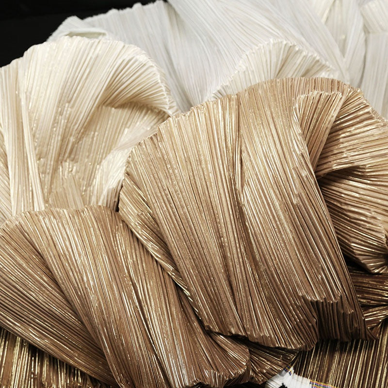 Rehaussez la décoration de votre mariage avec notre superbe tissu à texture plissée dégradée à chaud doré ! Le design unique plissé et doré ajoute une touche d'élégance et de sophistication, tandis que l'effet dégradé crée un impact visuel fascinant. Parfait pour créer une atmosphère luxueuse et glamour lors de votre journée spéciale.