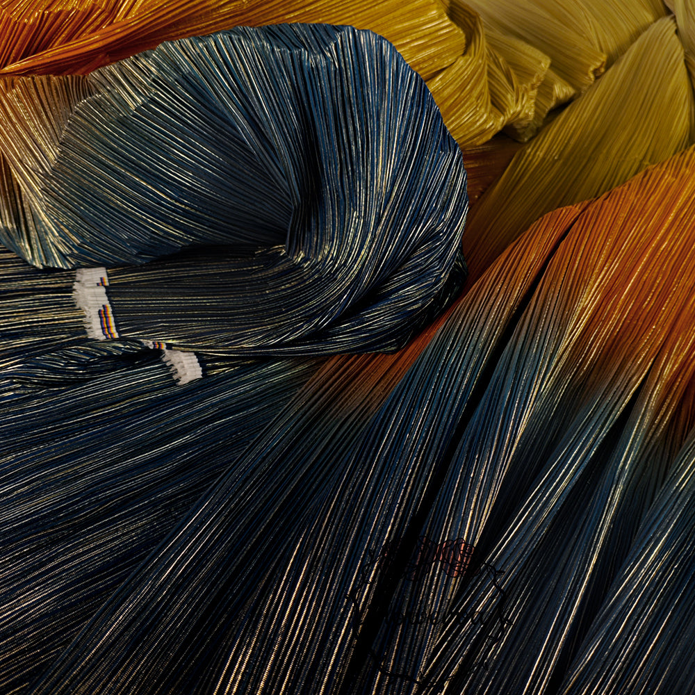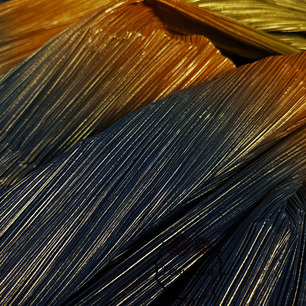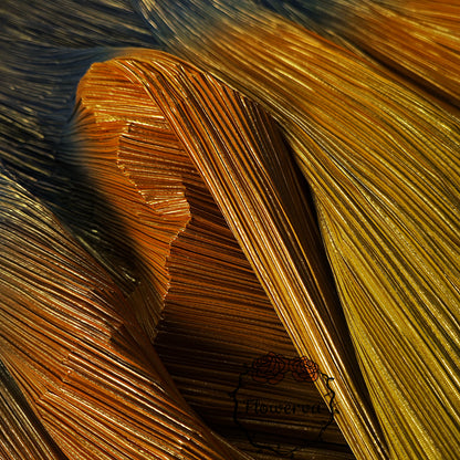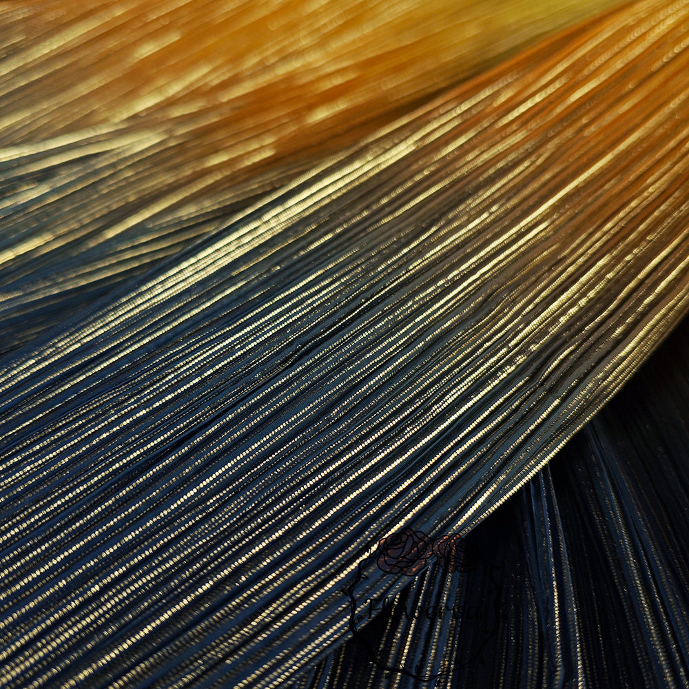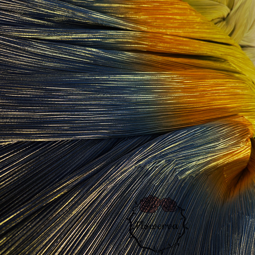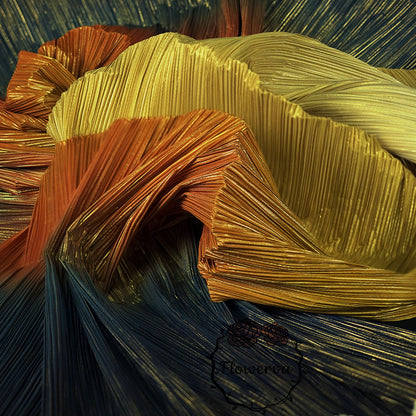 Ce tissu est un véritable incontournable avec son dégradé de couleurs jaune, orange et bleu, rehaussé d'un estampage doré à chaud. La texture unique froissée et plissée ajoute une touche d'élégance et est parfaite pour les décorations de mariage. Faites une déclaration avec ce tissu accrocheur et créez un événement vraiment inoubliable.