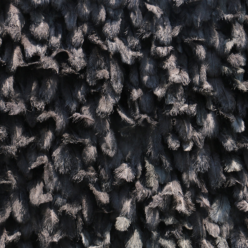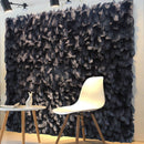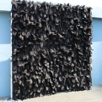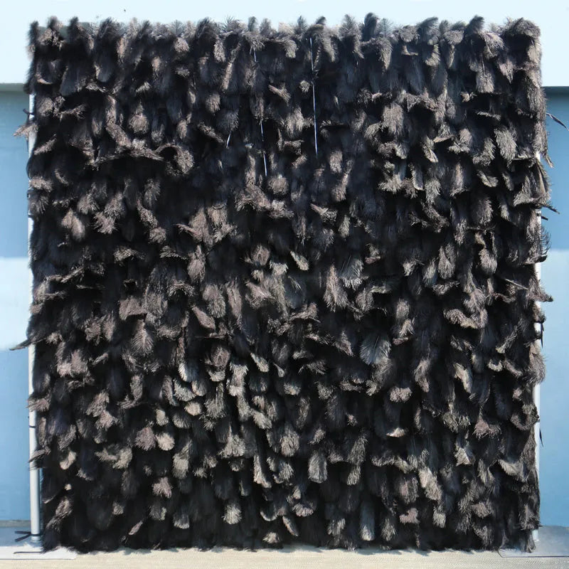 This bold, textured black feather wall (with lush, layered plumage) is a sleek choice for modern events: it elevates photo booths or lounge areas (paired with minimalist white furniture here), infusing spaces with edgy, luxurious charm.