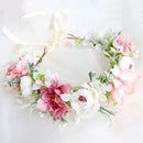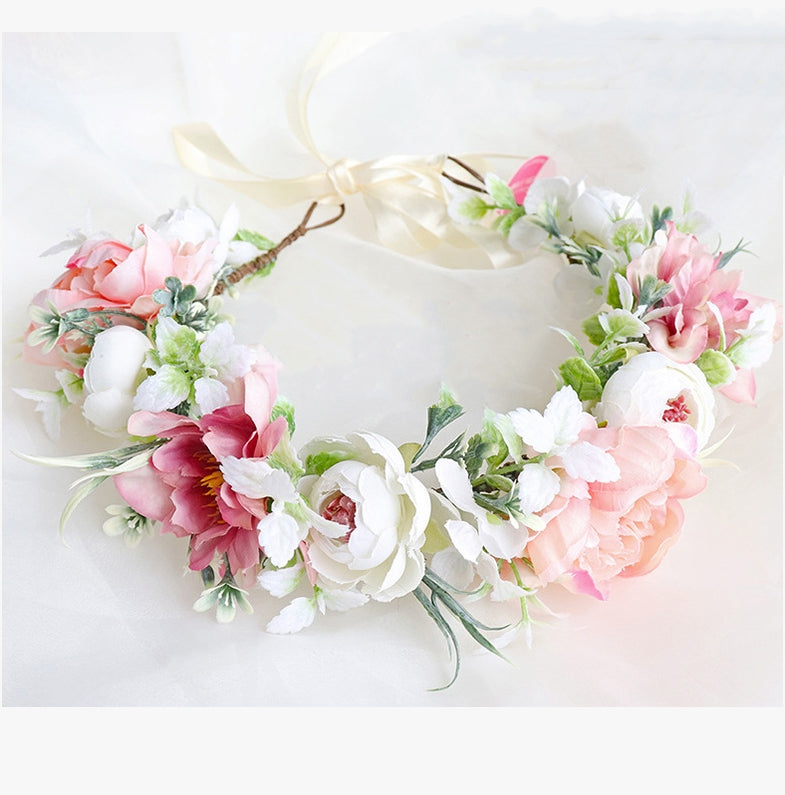 Adorn yourself with this exquisite bridal wreath headpiece, boasting lush pink peonies and camellias for a graceful and sophisticated look. An ideal choice for the special day, it is sure to elevate your bridal ensemble with timeless elegance.