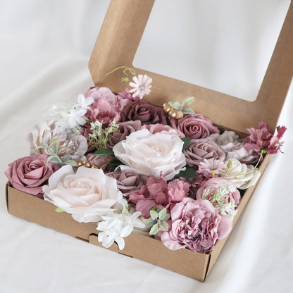 Simulated silk flowers: pink rose x5, light purple rose x3, light pink rose x3, orange rose x2, other flowers x3