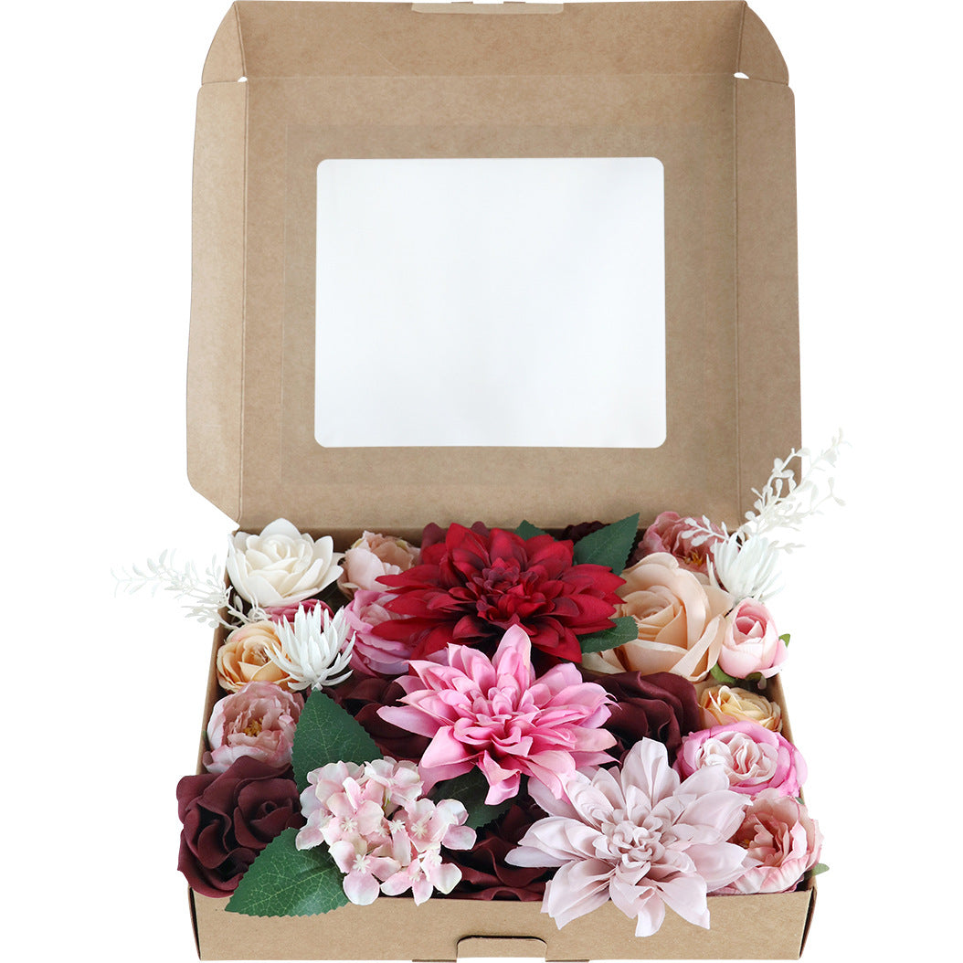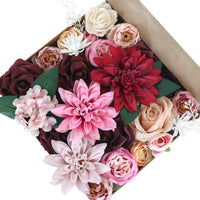 Simulated silk flowers: pink chrysanthemums x1, red chrysanthemums x1, dark red roses x5, white flowers x1, other flowers x3