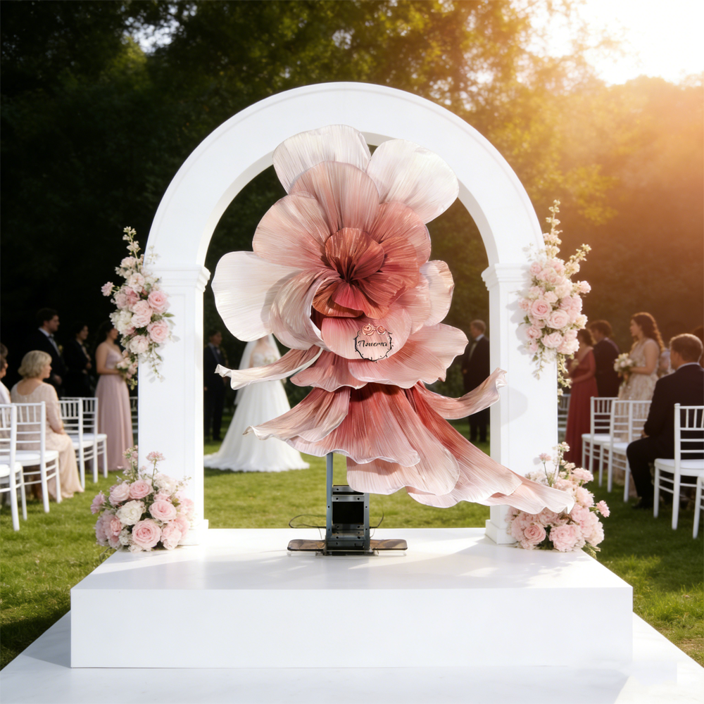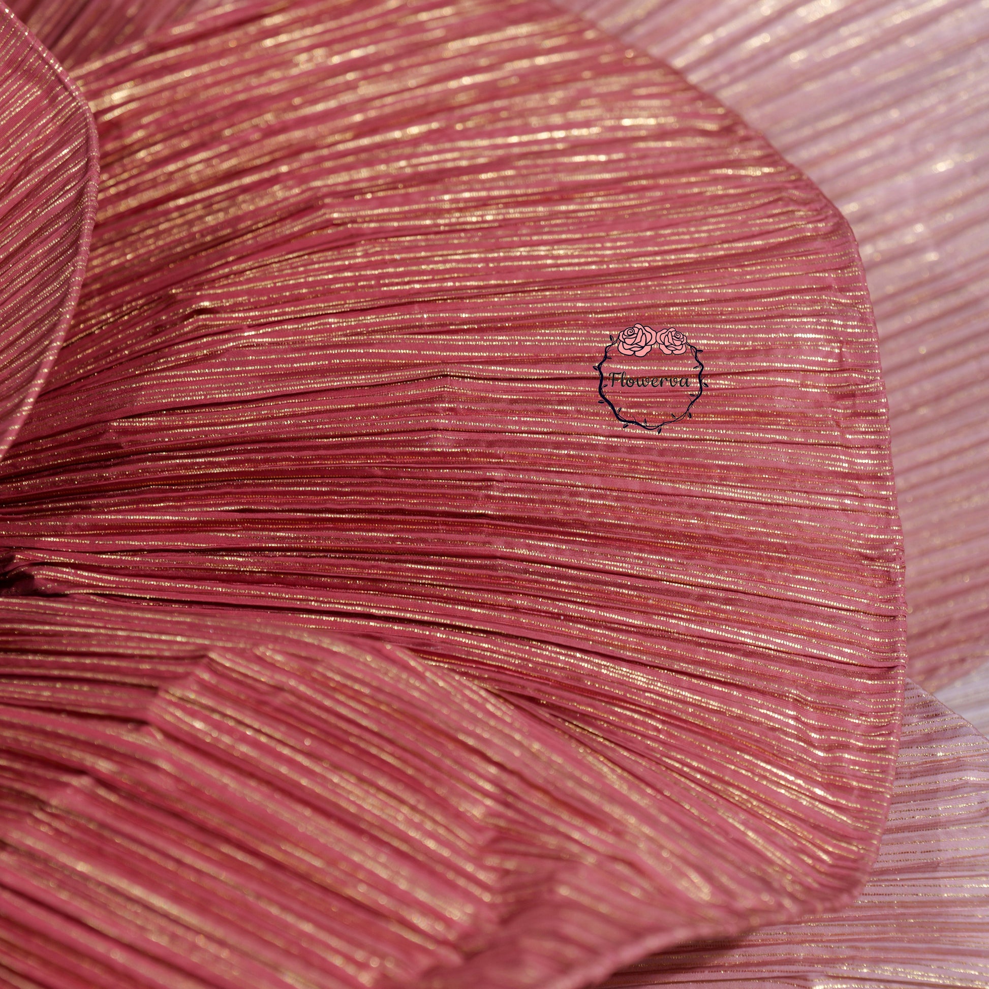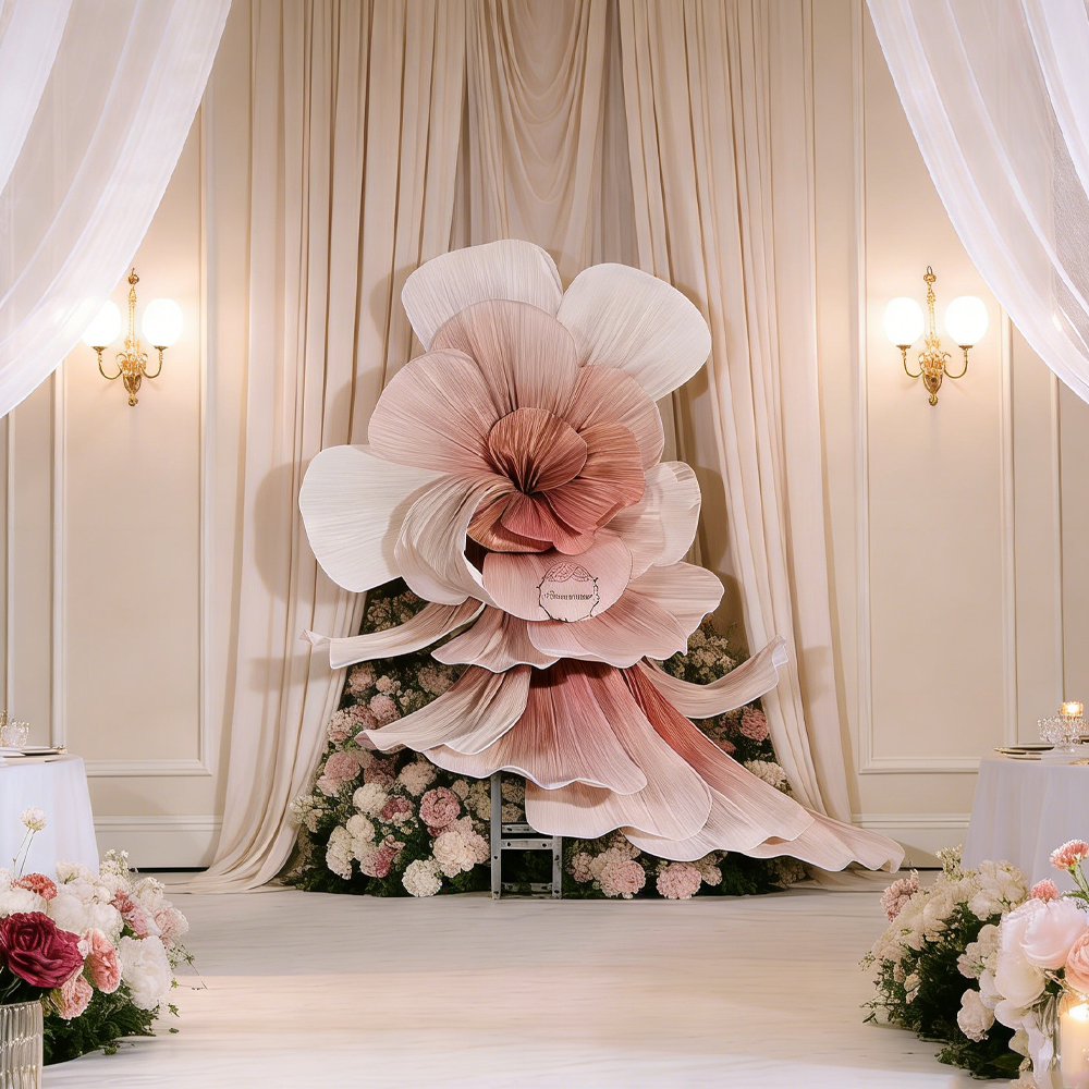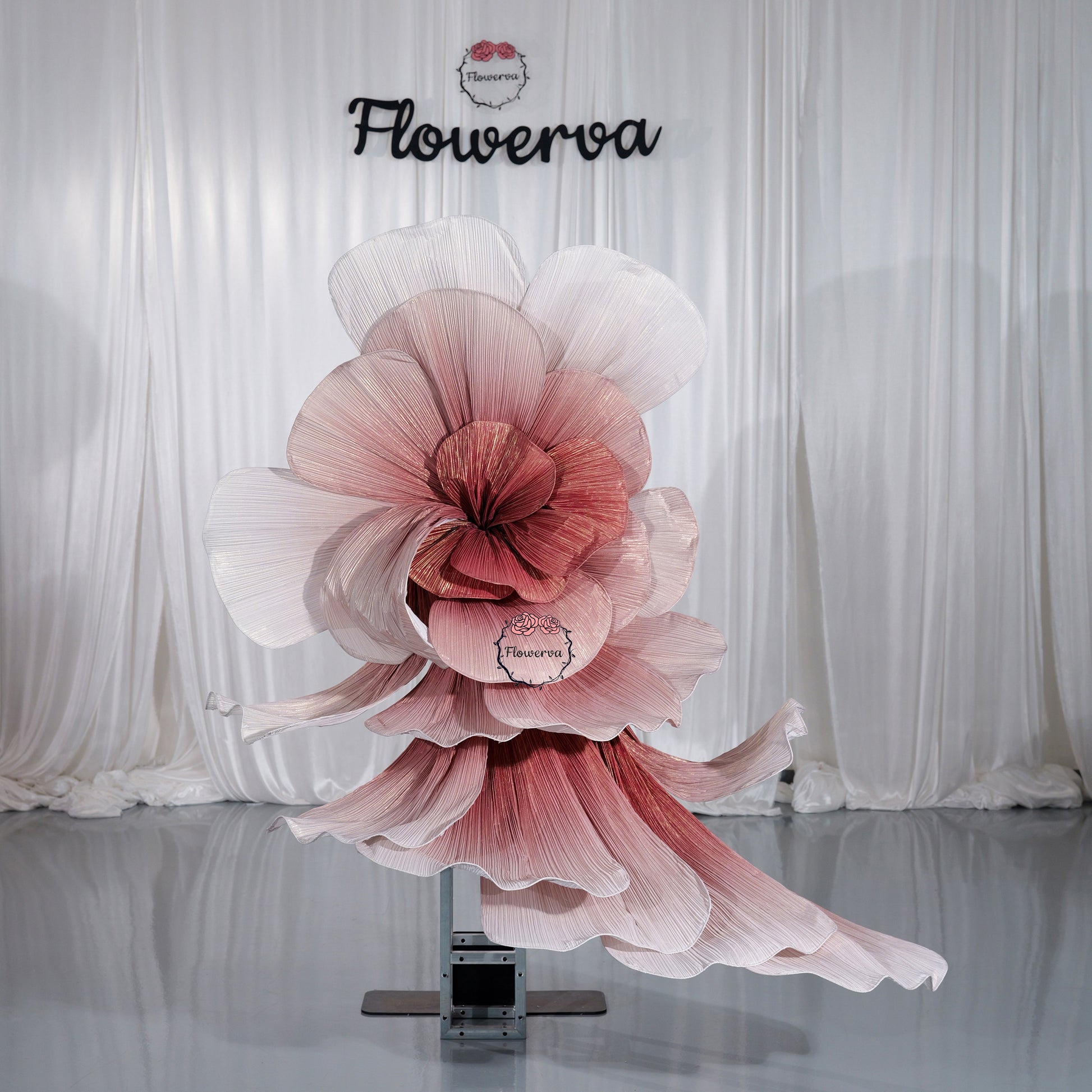 This oversized artistic floral installation is crafted from pleated fabric, featuring a gradient color palette of soft pink to deep rose. Shaped like a blooming giant flower (with layered, flowing petal structures), it stands on a metallic base, exuding a modern, ethereal aesthetic.