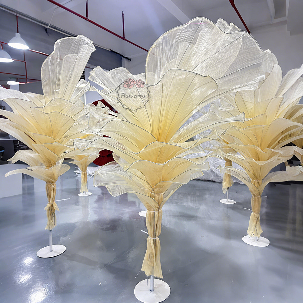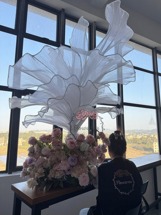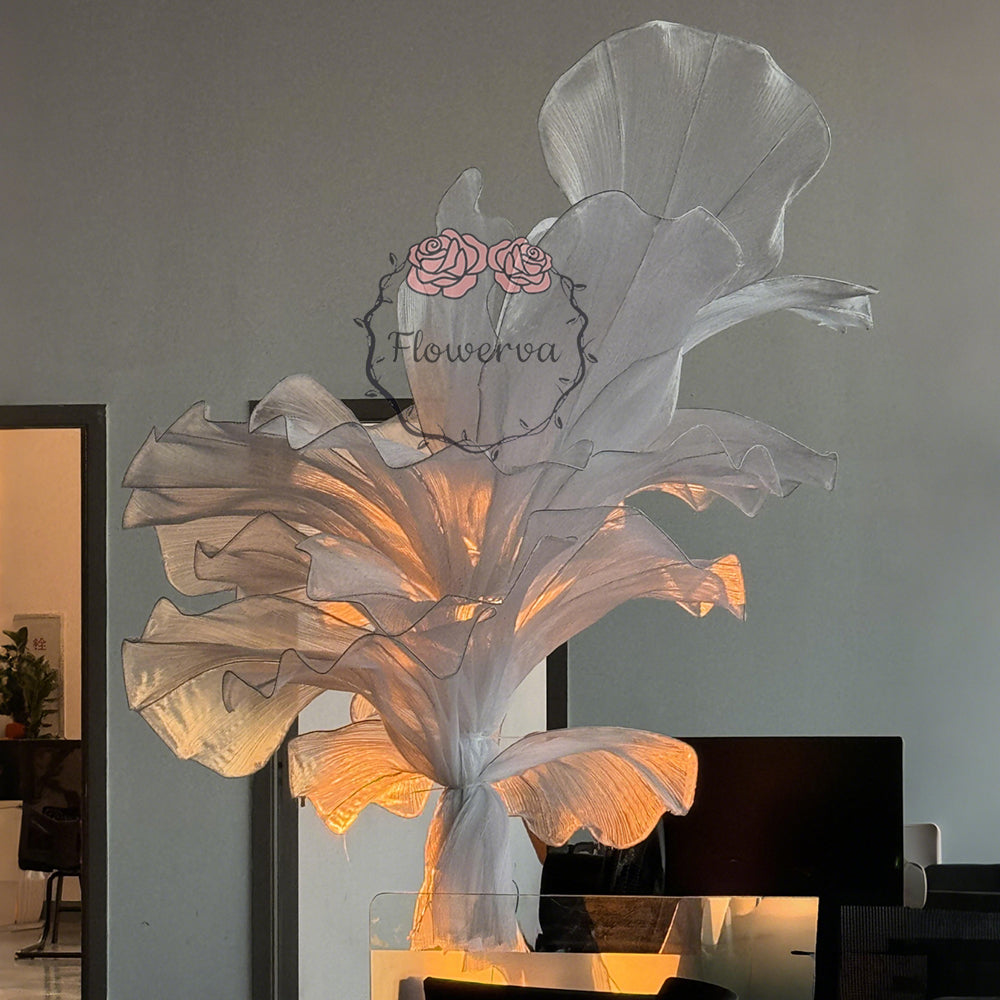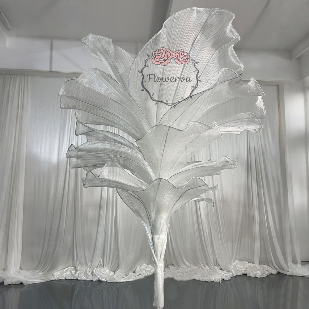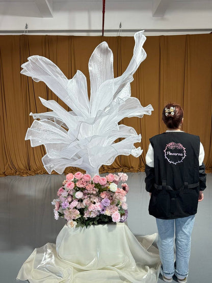 This piece is crafted from a lightweight, subtly shimmering fabric defined by fine, linear textures that catch light to create a soft, luminous finish. Shaped into large, leaf-like forms with gently ruffled edges, the fabric’s pliable drape balances structured silhouettes with organic, flowing movement—mimicking the natural curves of foliage. The monochromatic palette (paired with its light-reflective quality) lends the piece an elegant, ethereal vibe, while the layered arrangement adds depth and dimension.