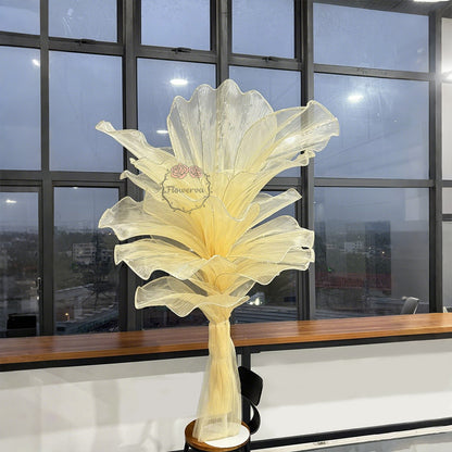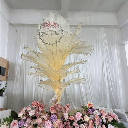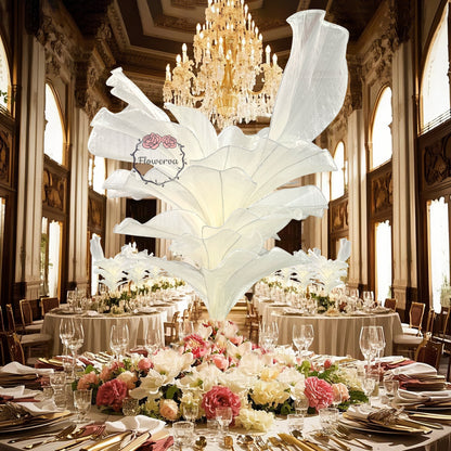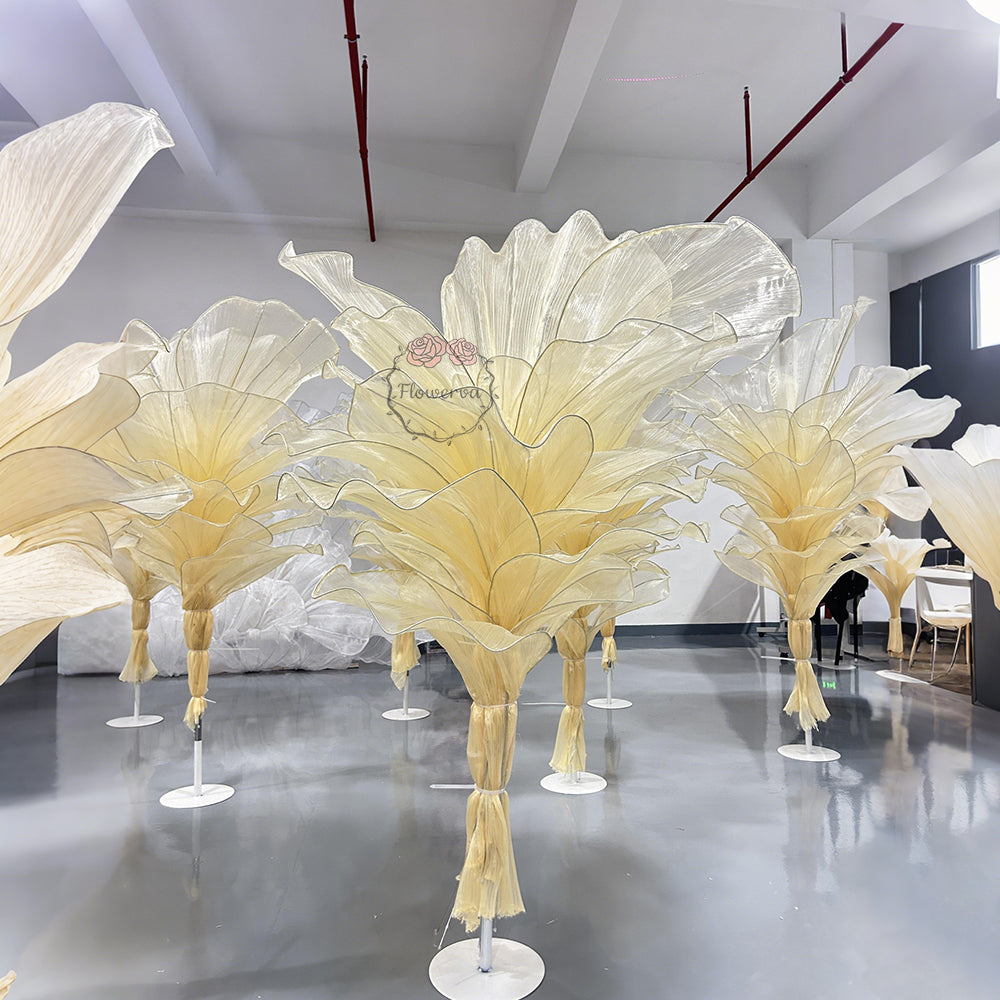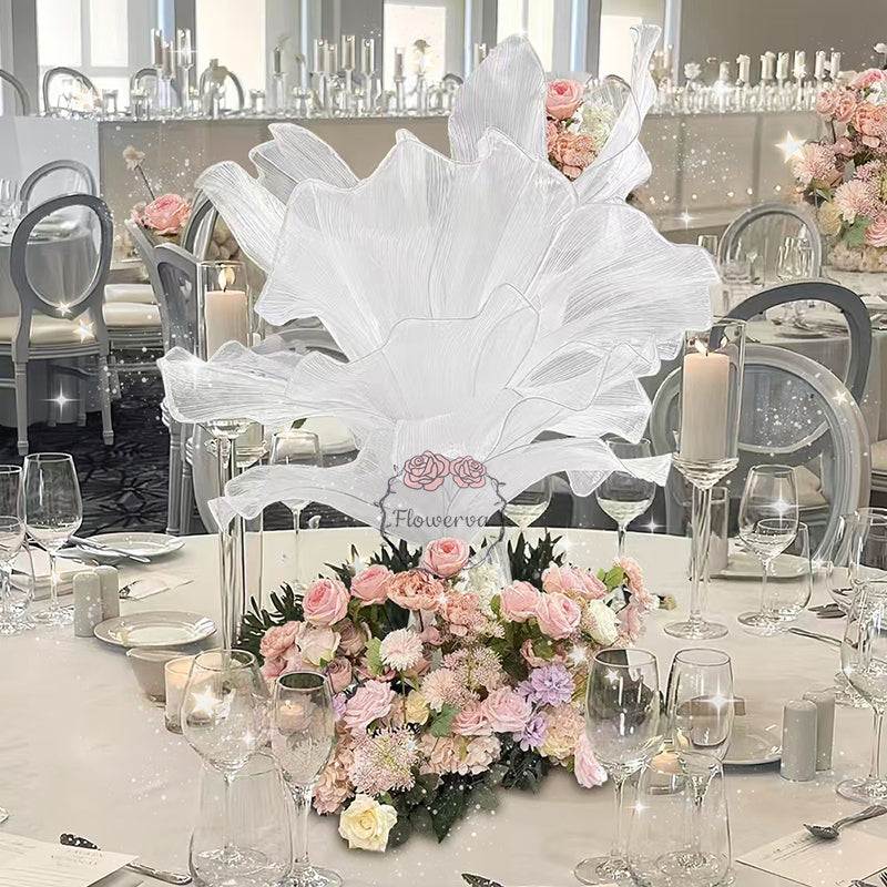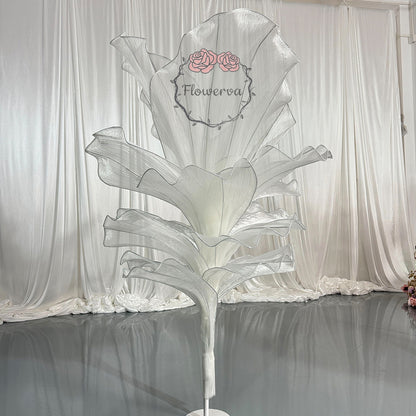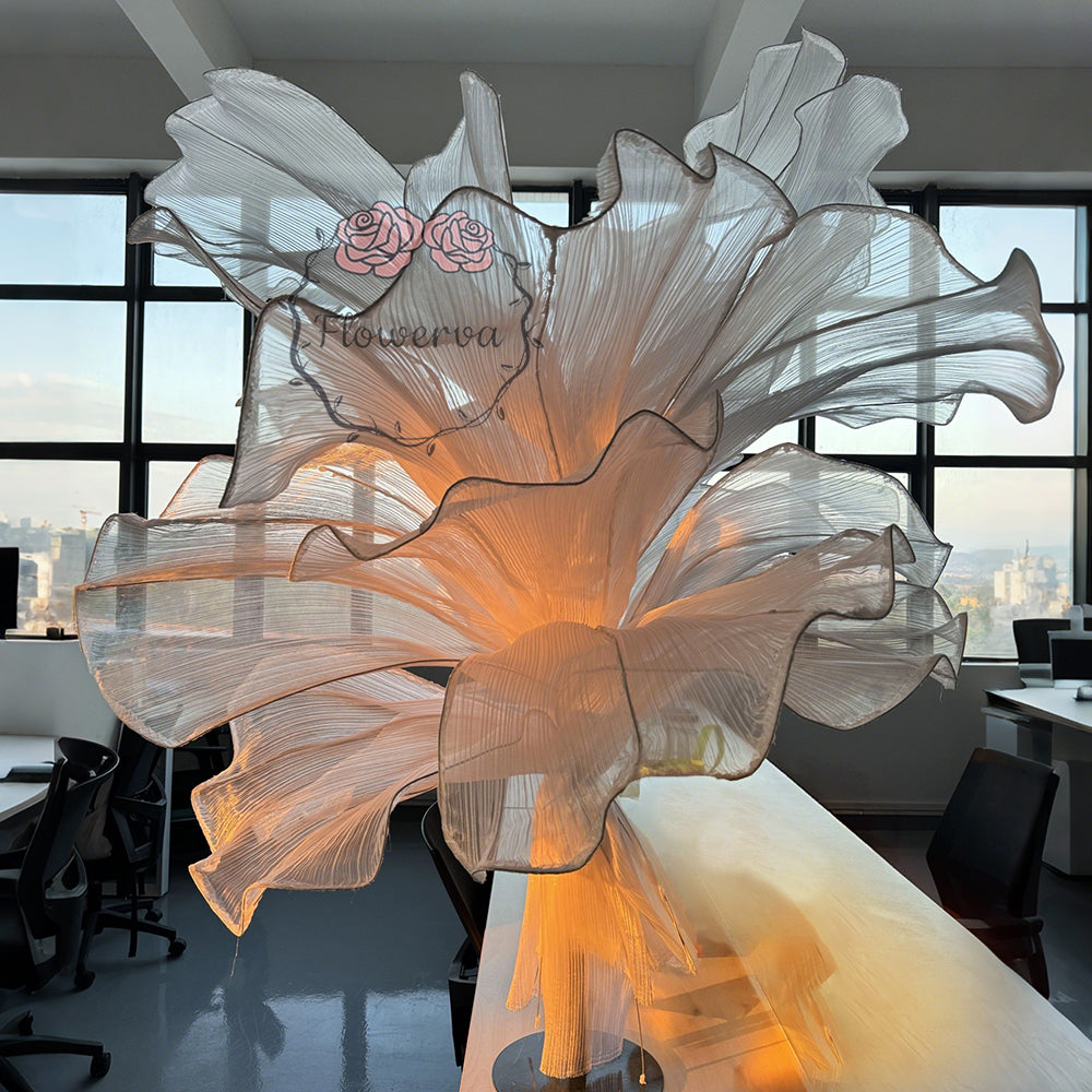 This piece is crafted from a lightweight, subtly shimmering fabric defined by fine, linear textures that catch light to create a soft, luminous finish. Shaped into large, leaf-like forms with gently ruffled edges, the fabric’s pliable drape balances structured silhouettes with organic, flowing movement—mimicking the natural curves of foliage. The monochromatic palette (paired with its light-reflective quality) lends the piece an elegant, ethereal vibe, while the layered arrangement adds depth and dimension.