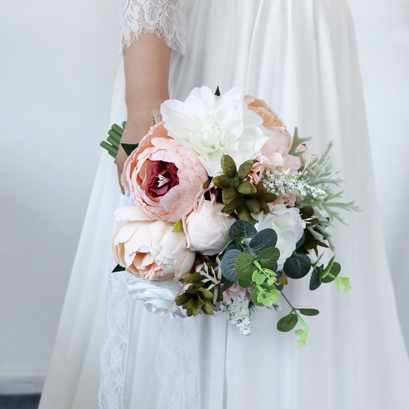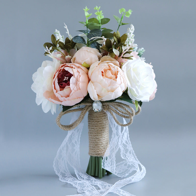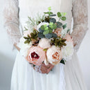 Held in lace-adorned hands, the bouquet’s full, rounded shape feels lush yet lightweight — ideal for carrying through ceremonies and photo sessions. Its lifelike fabric and silk textures ensure it stays perfectly preserved as a memento, while the gentle, cohesive tones bring a quiet, romantic charm to every wedding detail.
