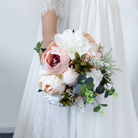 Crafted for the romantic bride, this bouquet is a study in soft sophistication: voluminous blush peonies (their layered petals blushing from cream to deep rose at the core) anchor the design, joined by creamy white blooms and framed by muted gray-green eucalyptus, earthy ferns, and delicate baby’s breath. The palette feels both fresh and timeless, fitting for garden, barn, or classic chapel weddings.