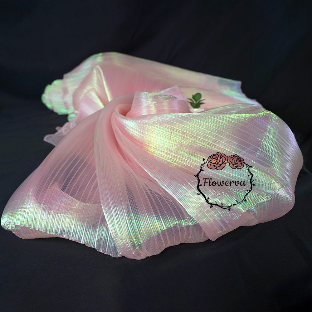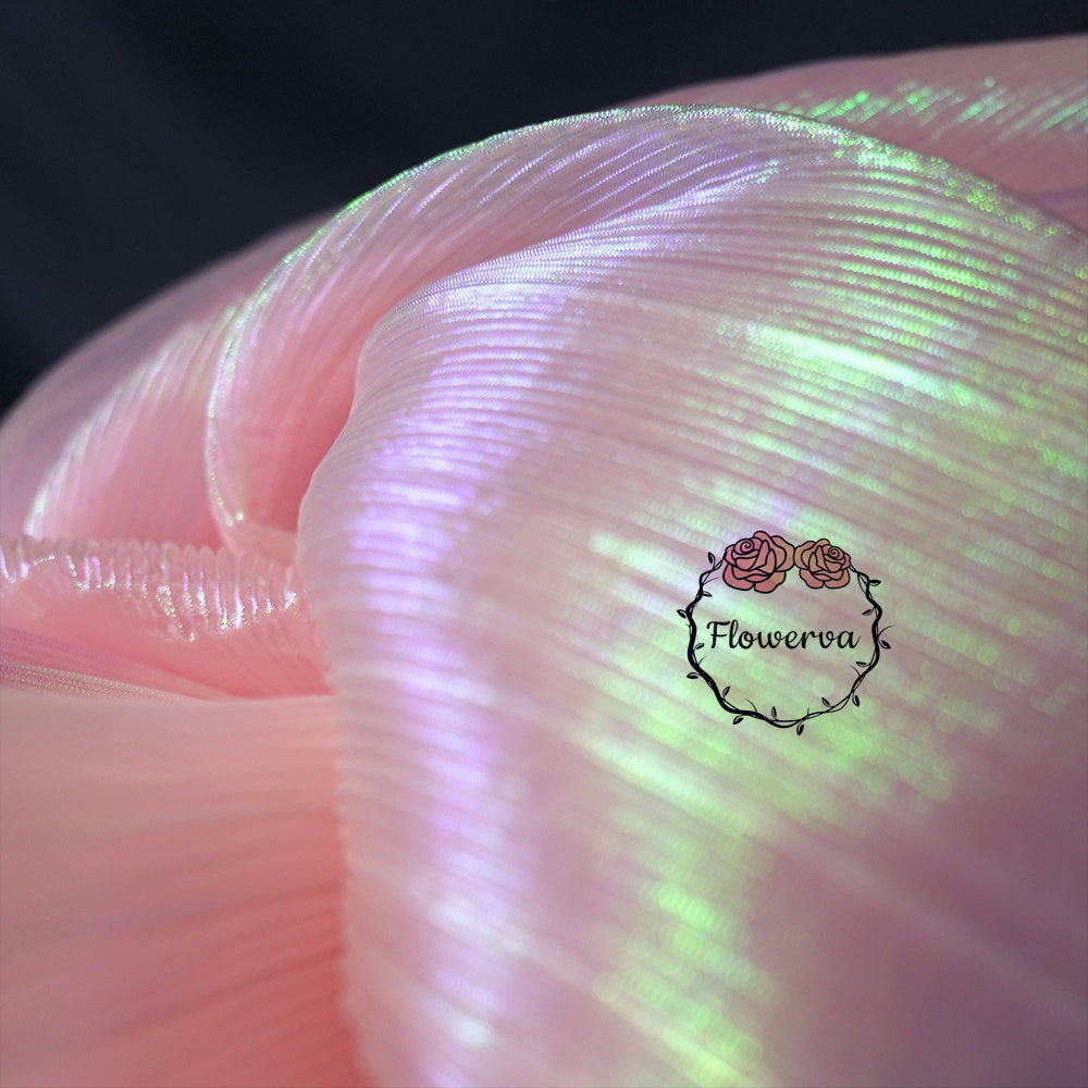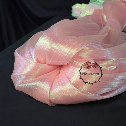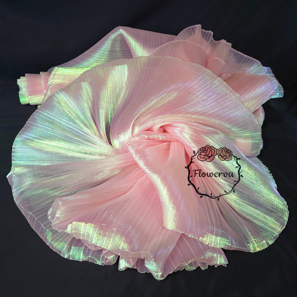 This fabric features a lightweight, airy texture with crisp, fine pleats that hold shape vividly while maintaining soft, dynamic movement. Its surface carries a distinct iridescent or luminous sheen—catching light to shift tones along the folds, enhancing the material’s dimensional, almost ethereal quality (regardless of base color). The pleated construction balances structured fullness with delicate flexibility, making it ideal for sculptural, flower-like installations or flowing, textured decor pieces.